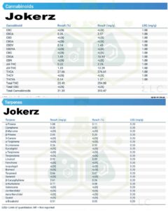 CBGA: 1.58% THA: 26.6% CBN: .210% Terpinolene: 0.701% Pinene: .087% Beta-Myrcene: 0.273 Limonene: .102%, beta-Caryophyllene: 0.634 Humulene: .25%
